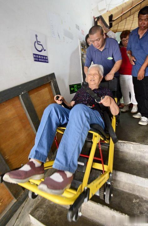 2024年7月11日,北京市朝阳区青年路社区一老旧小区居民在楼内体验“爬楼机”。新华社记者 李欣 摄